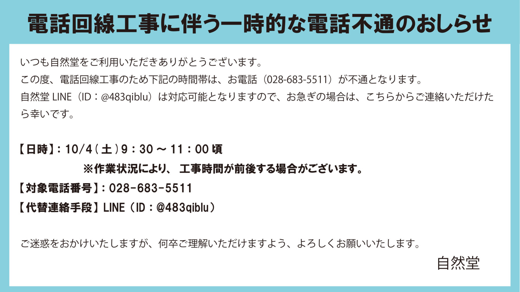電話回線工事に伴う一時的な電話不通のおしらせ
